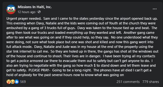 The mission agency posted an urgent prayer request just hours before, reporting the missionaries were under siege after being ambushed by "a gang of 3 trucks full of guys" – then being "holed up" as gangs shot out the windows of the property. (See image of post here)