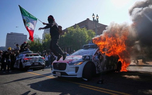 Social media over the weekend was dotted with video clips of rioters assaulting immigration officers, burning vehicles, blocking at least one city highway and throwing concrete rocks at law enforcement officers. Often the rioters were standing atop cars, some abandoned and graffiti-littered, waving the flag of Mexico.