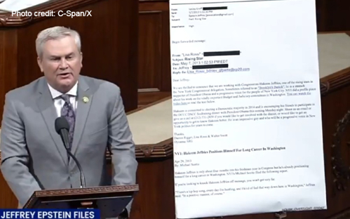 In a second gotcha from Republicans, Rep. James Comer went to the House floor this week to expose a 2013 fundraising email that was sent to Epstein. The email, shown on a placard beside Comer, invited Epstein to attend a fundraising dinner for a Democrat congressman, Rep. Hakeem Jeffries. Jeffries is now the House Minority Leader.